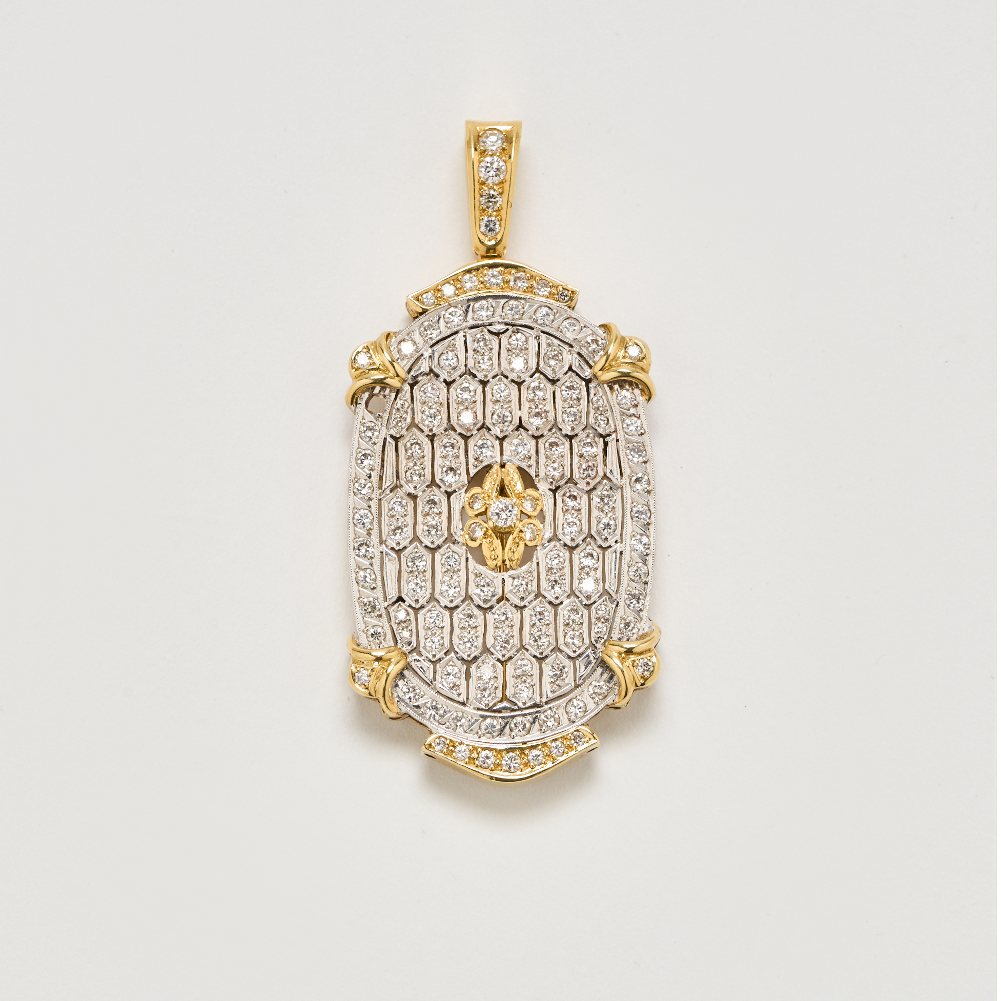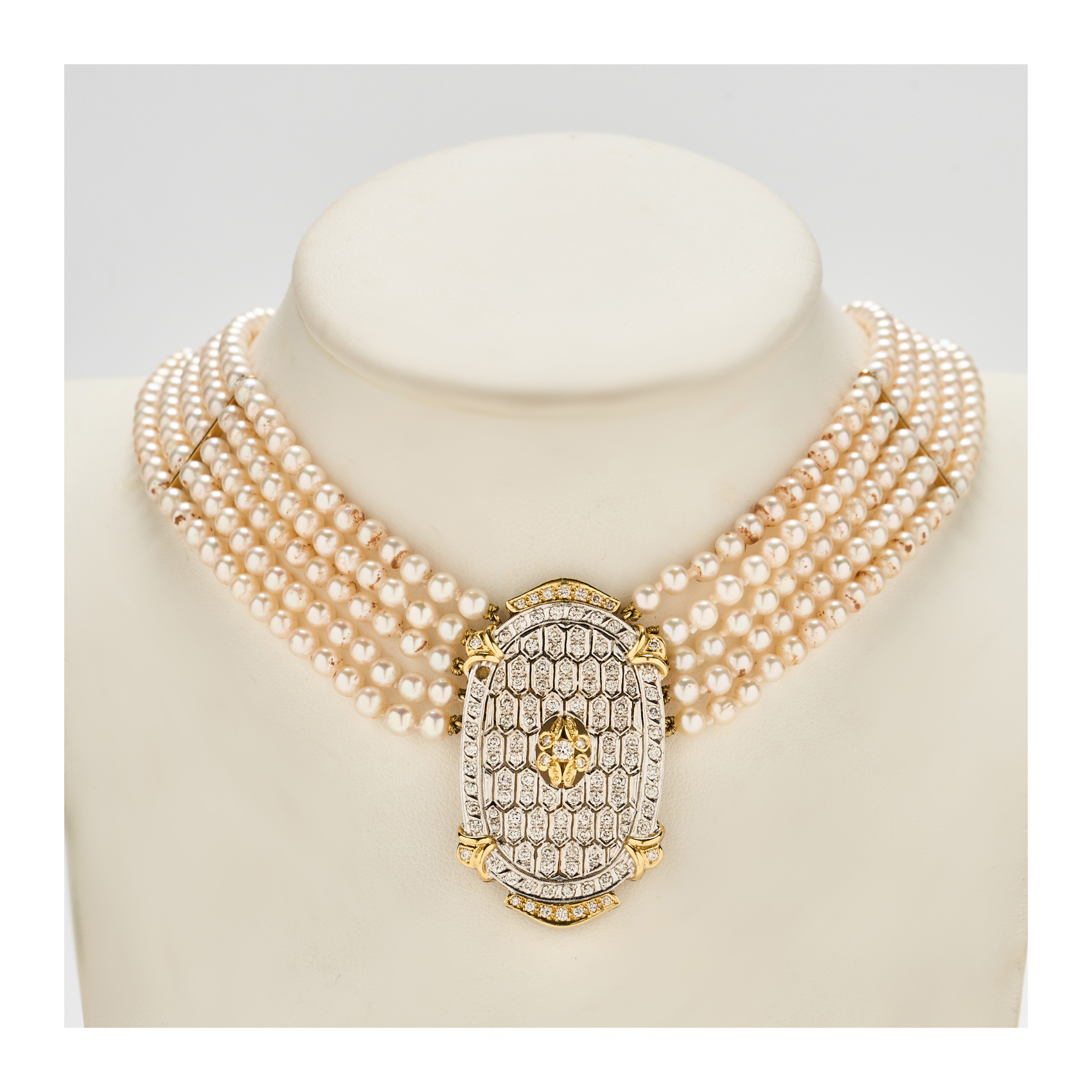 Collar de cinco tiras de perlas cultivadas de 4 mm. con broche colgante desmontable en oro bicolor y diamantes talla brillante, 5,5 x 2,7 cm.