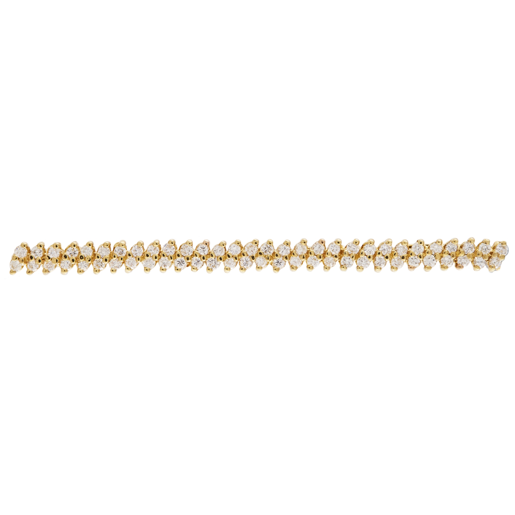 Aguja en oro con dos bandas de diamantes talla brillante engastados en garras, 7 cm.