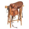Silla de montar amazona, ppios del s.XX. Adjunta cincha, pechopetral, bocado, riendas y dos pares de espuelas. Silla: 55 x 61 x 40 cm. Estimación: 450 – 550 €.
