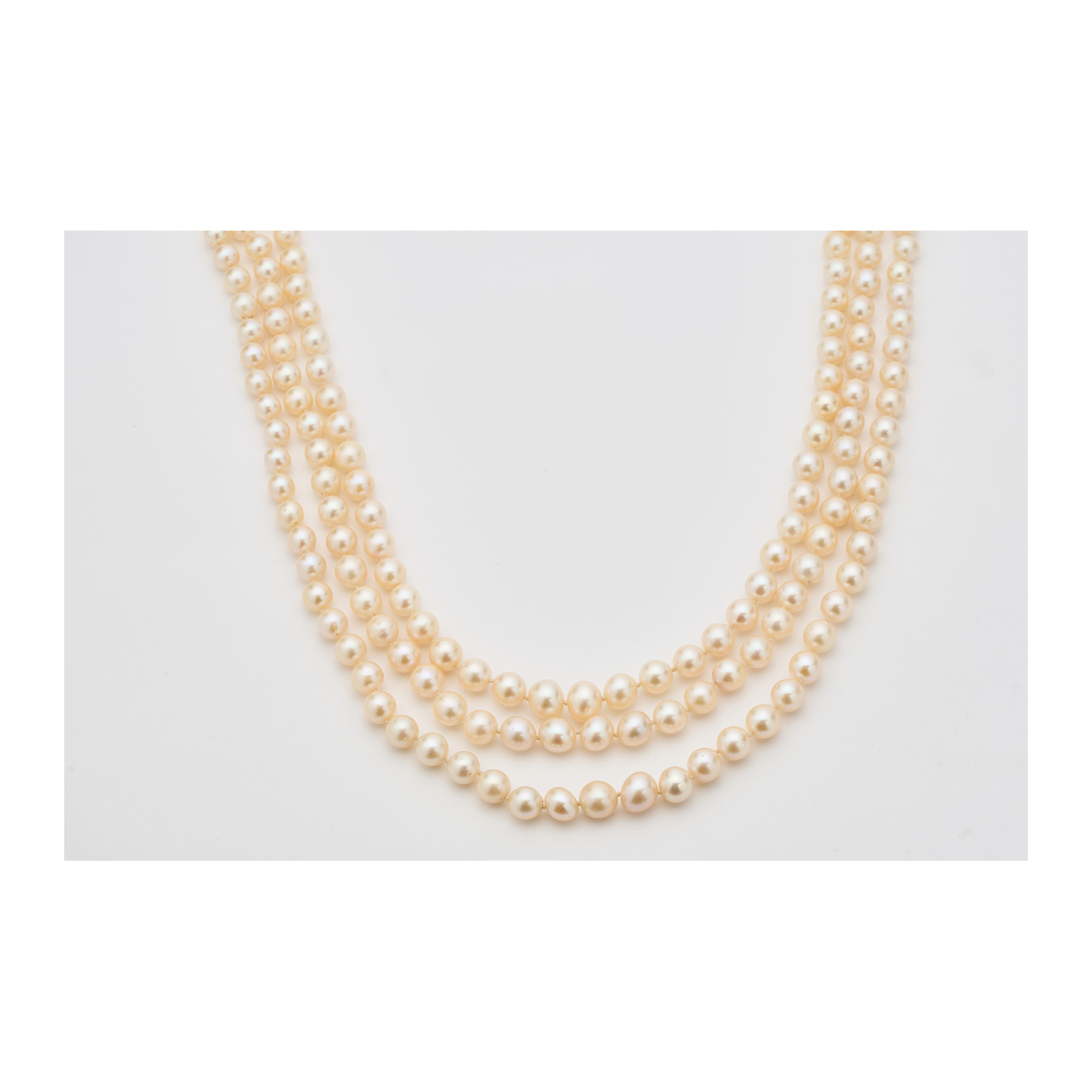 Collar de tres hilos de perlas cultivadas en degradé 10 – 7 mm. con cierre en oro blanco, esmeralda rectangular y diamantes tallas brillante y 8/8.