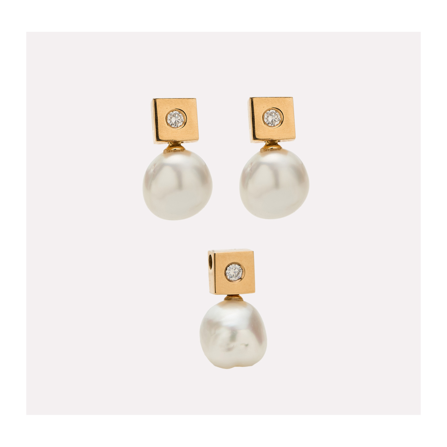 Juego de pendientes y colgante en oro con perla cultivada barroca de 15 x 15 y 16 x 15 mm. coronadas por cuadrado con diamante central talla brillante engastado en chatón.