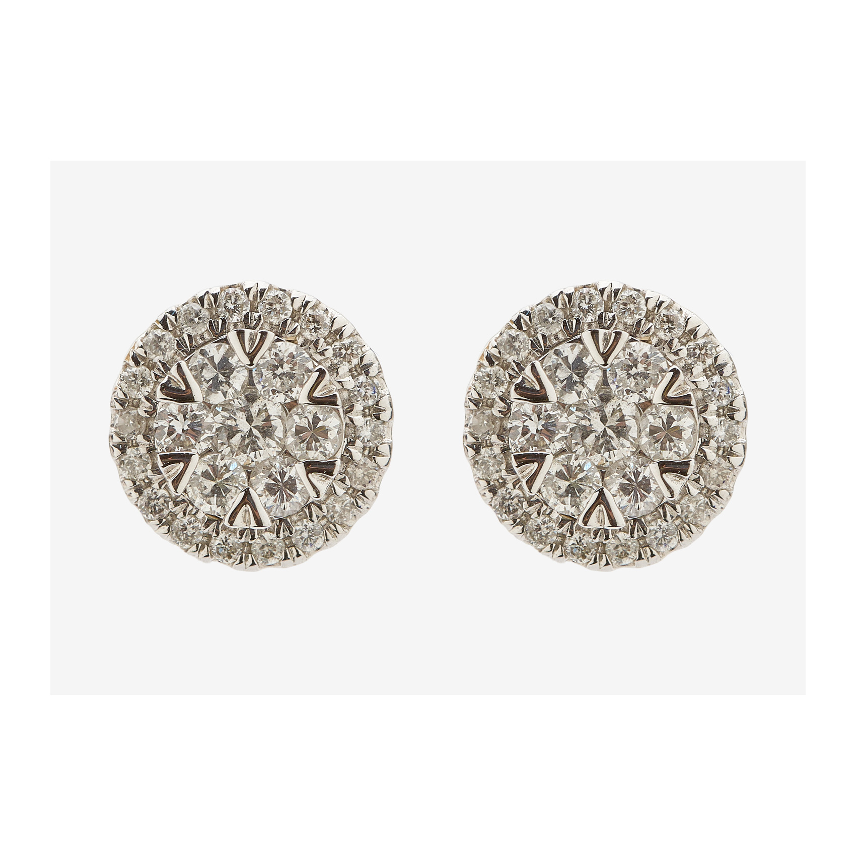 Pendientes circulares en oro blanco con rosetón y orla de diamantes talla brillante.