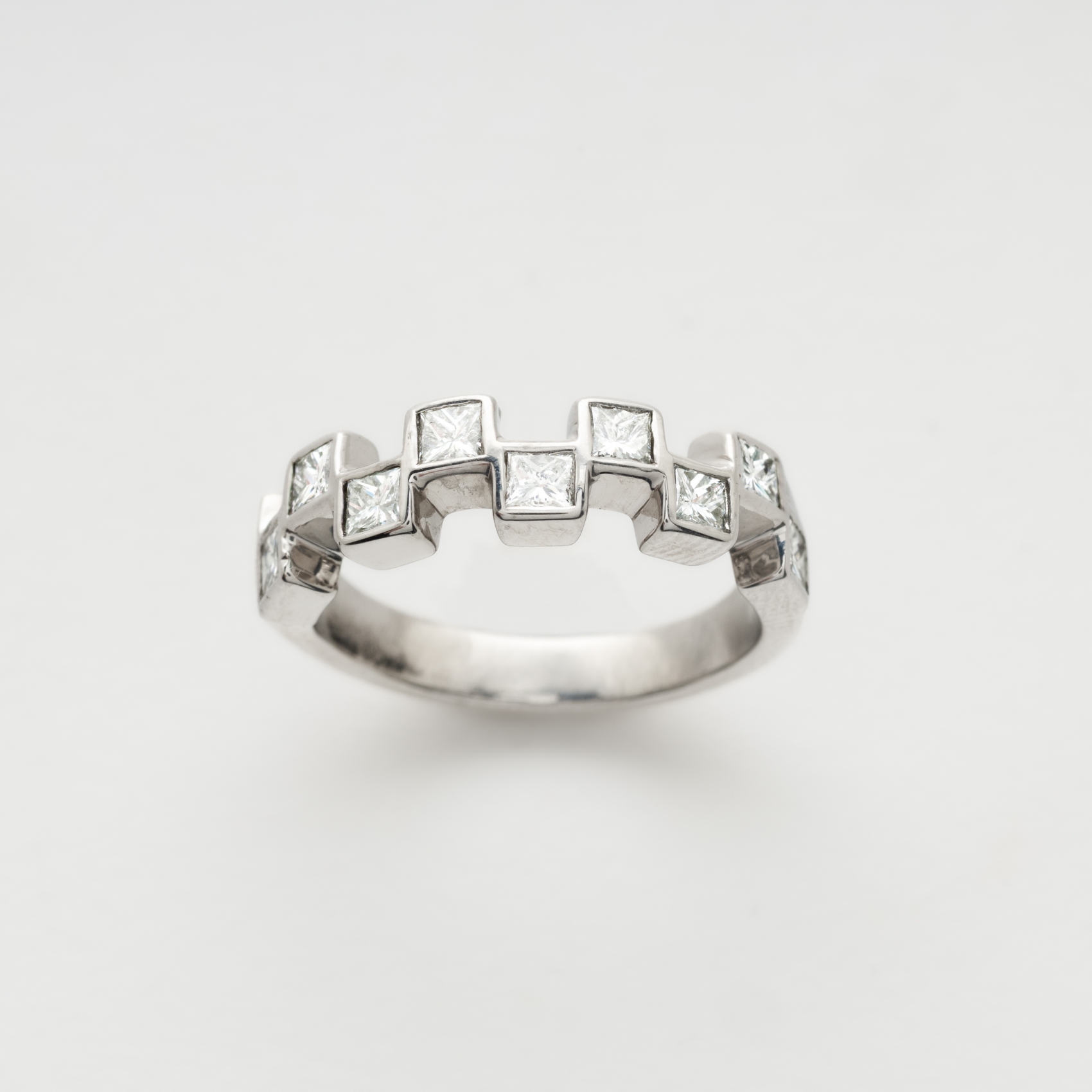 Sortija en oro blanco en forma feométrica con diamante talla brillante engastados en chatón.