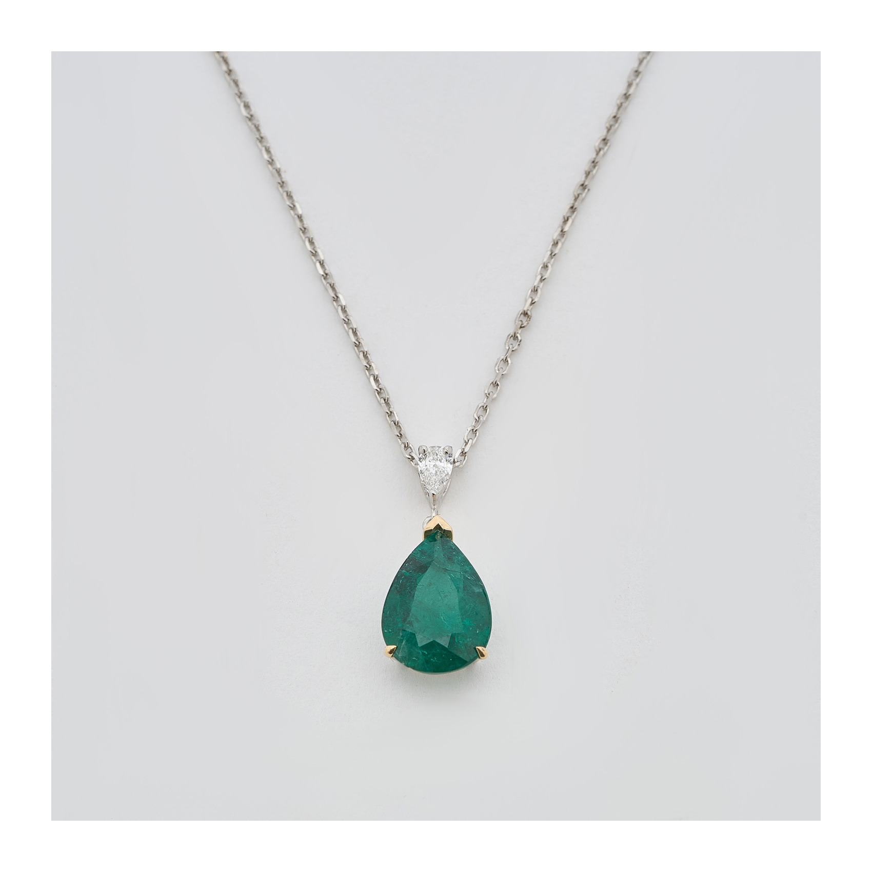 Gargantilla en oro blanco con diamante y esmeralda talla perilla.
