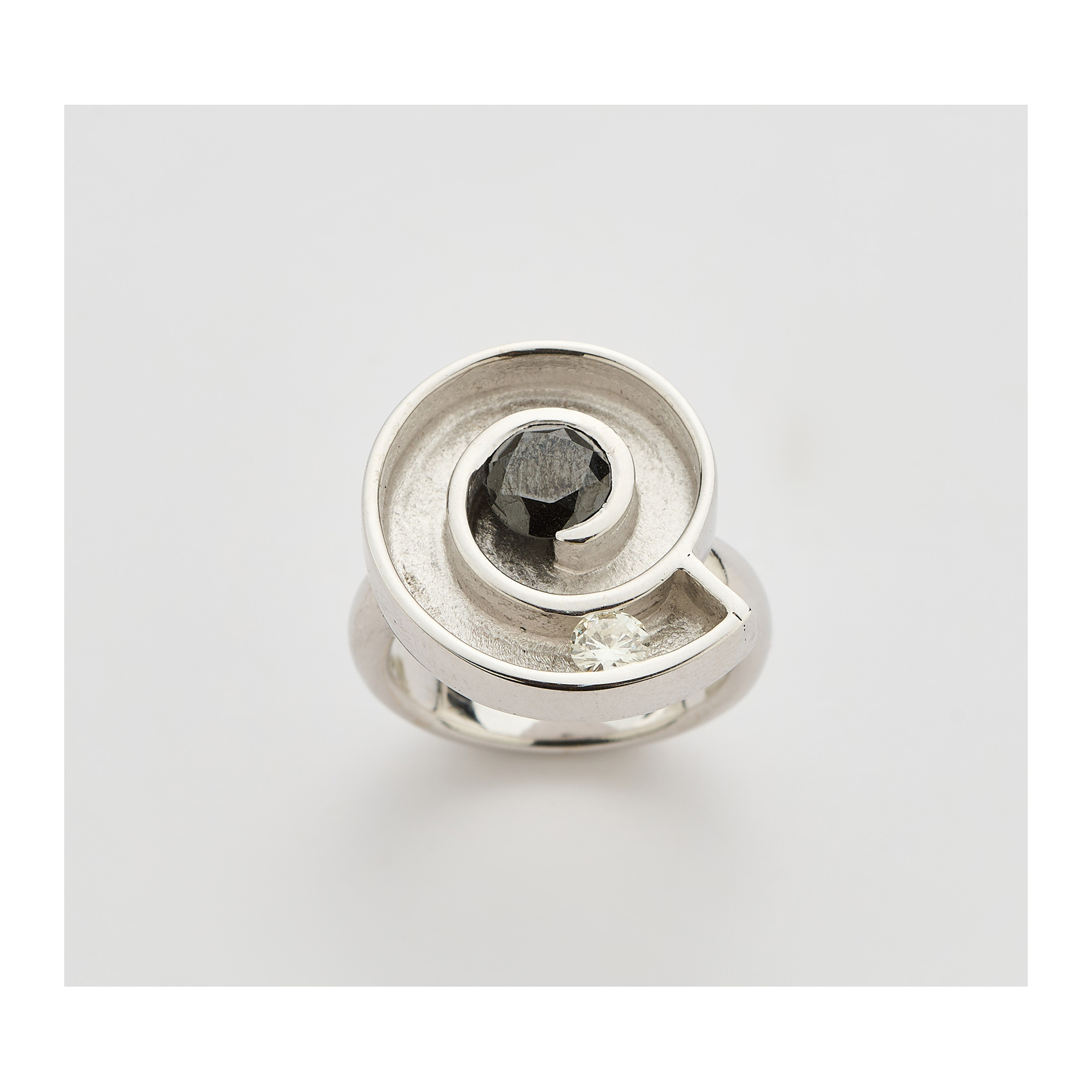Sortija diseño espiral en oro blanco mate y brillo con dos diamantes talla brillante, el central de color negro.