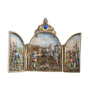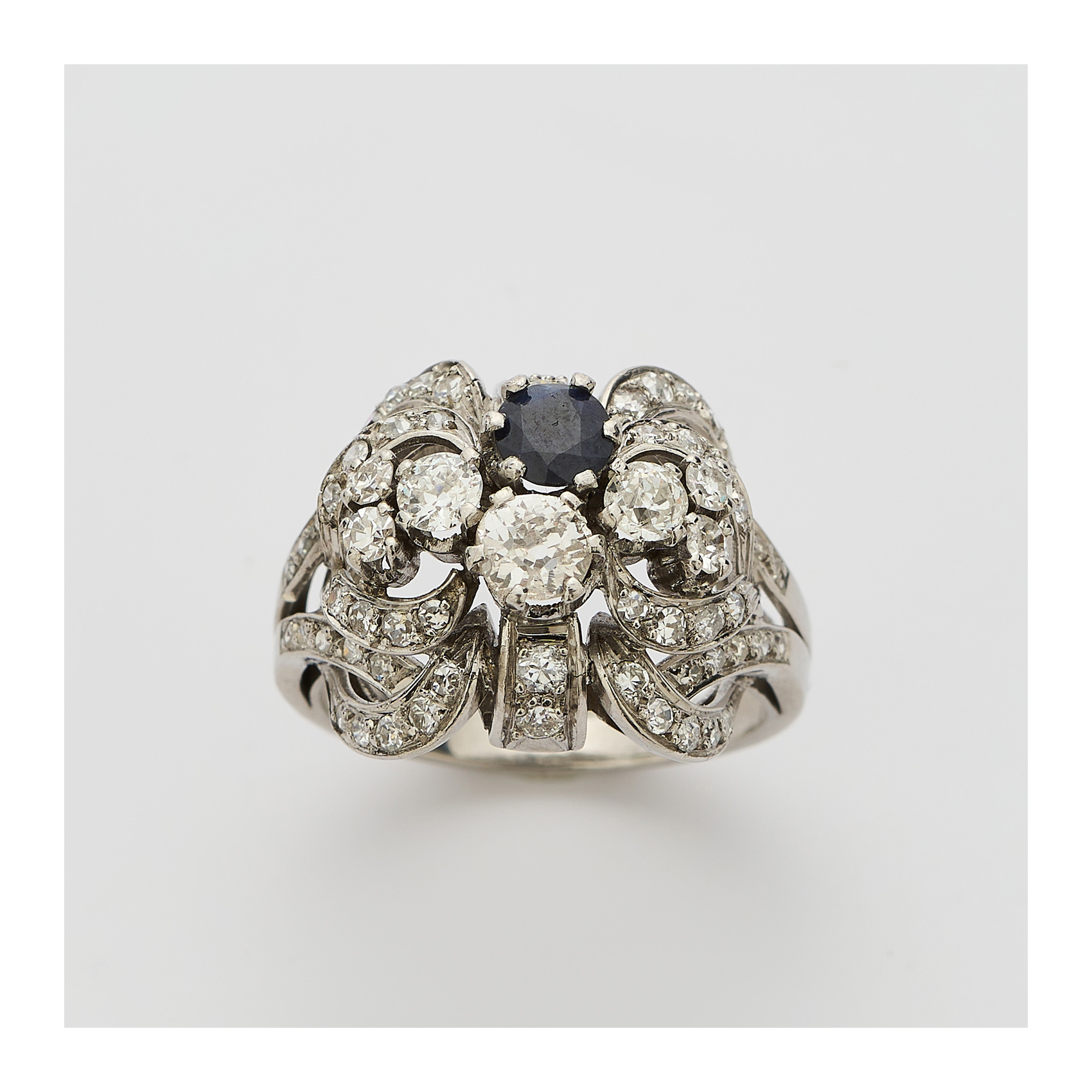 Sortija en platino con diamantes tallas brillante antigua y 8/8 y zafiro azul talla oval engastados en garras.