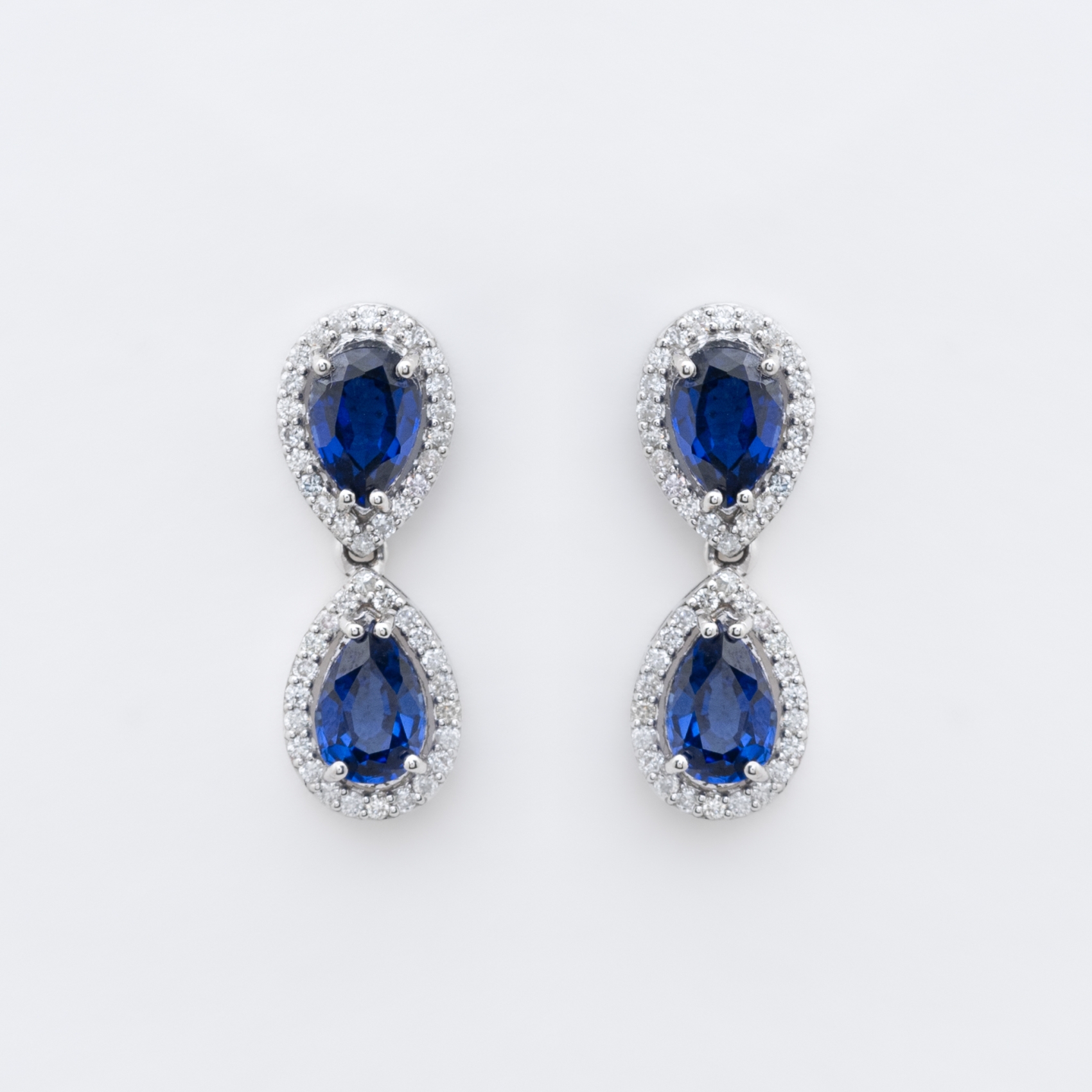 Pendientes en oro blanco con dos rosetones de zafiro azul talla perilla orlados por diamantes talla brillante.