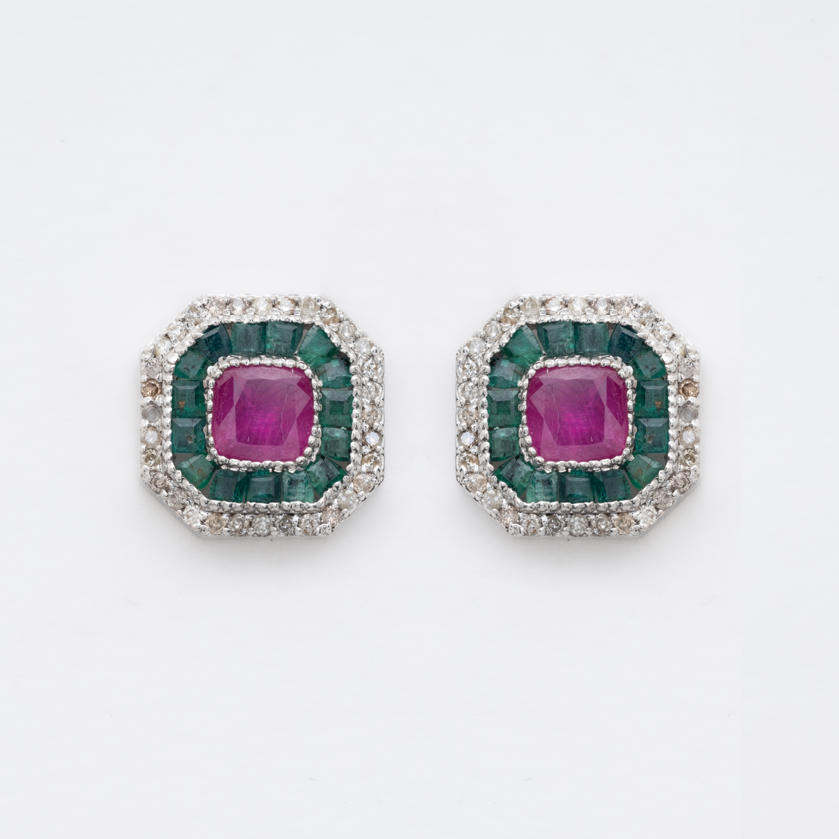 Pendientes diseño octogonal en oro blanco con rubí talla carré y doble orla de esmeraldas calibradas y diamantes talla brillante.