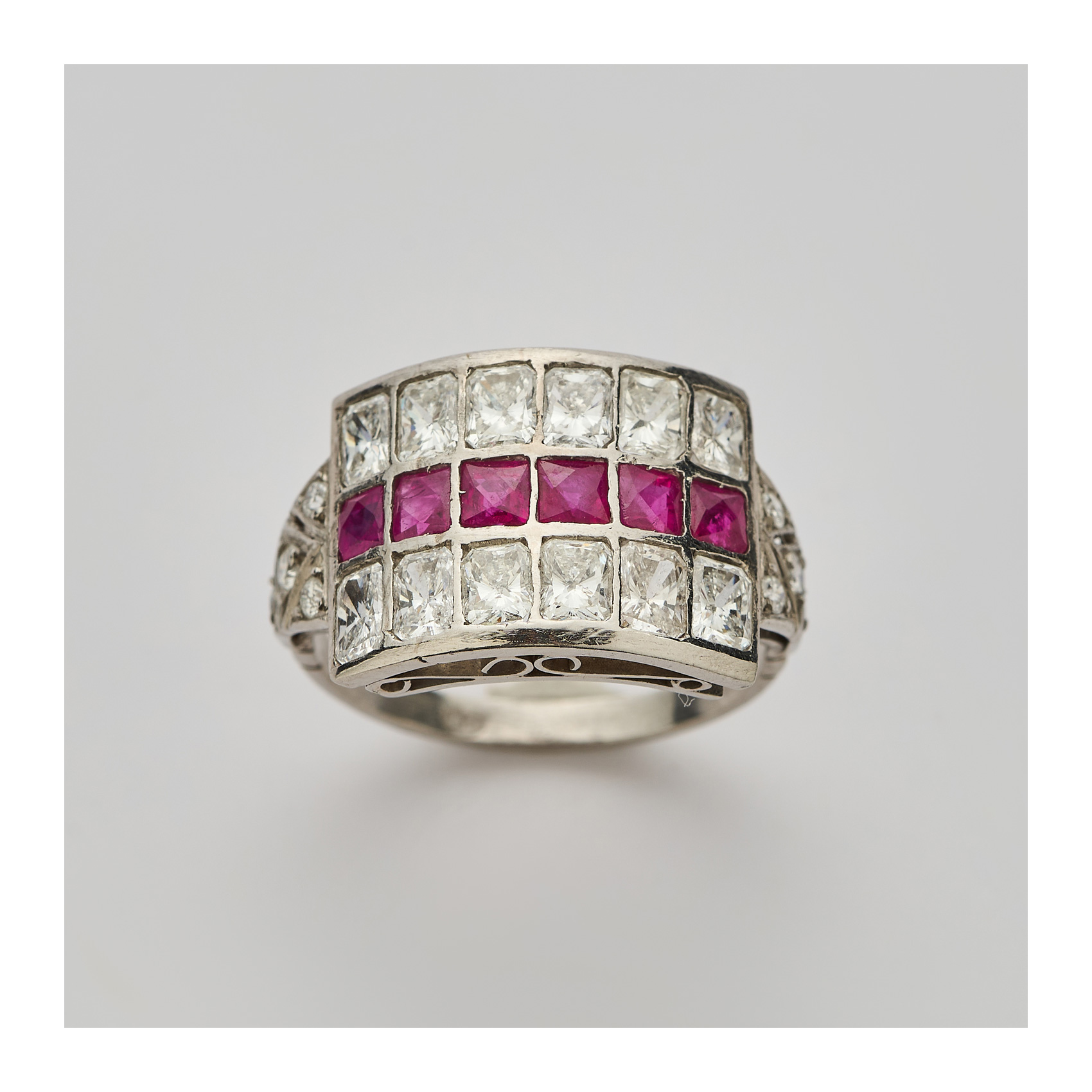 Sortija estilo Art Deco con centro de rubíes calibrados custodiado por bandas de diamantes talla octogonal.