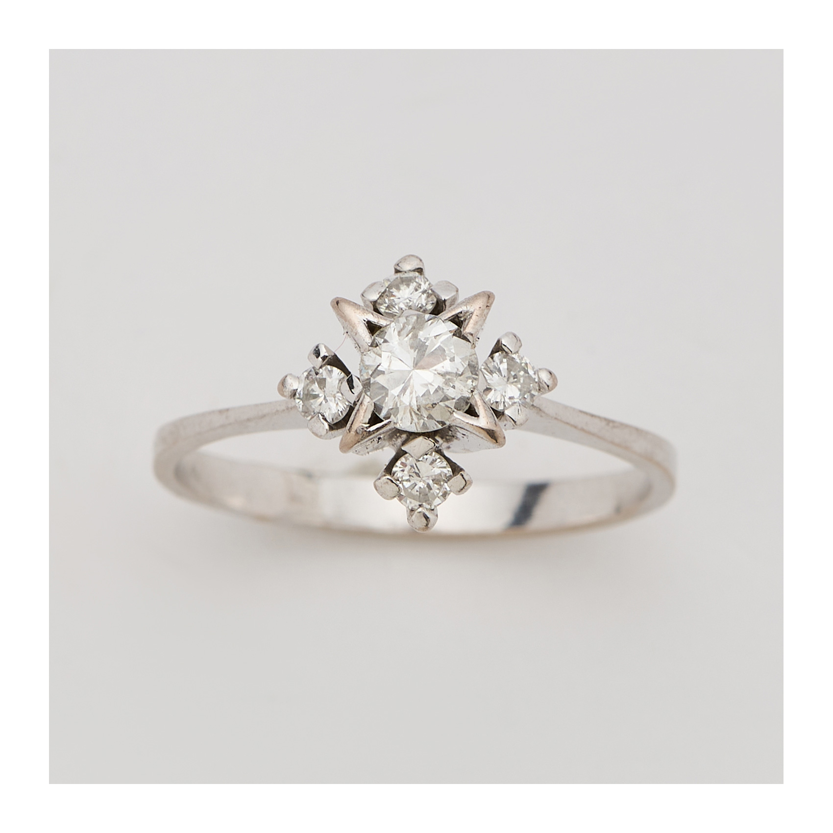 Sortija rosetón en oro blanco con diamantes talla brillante engastados en garras.