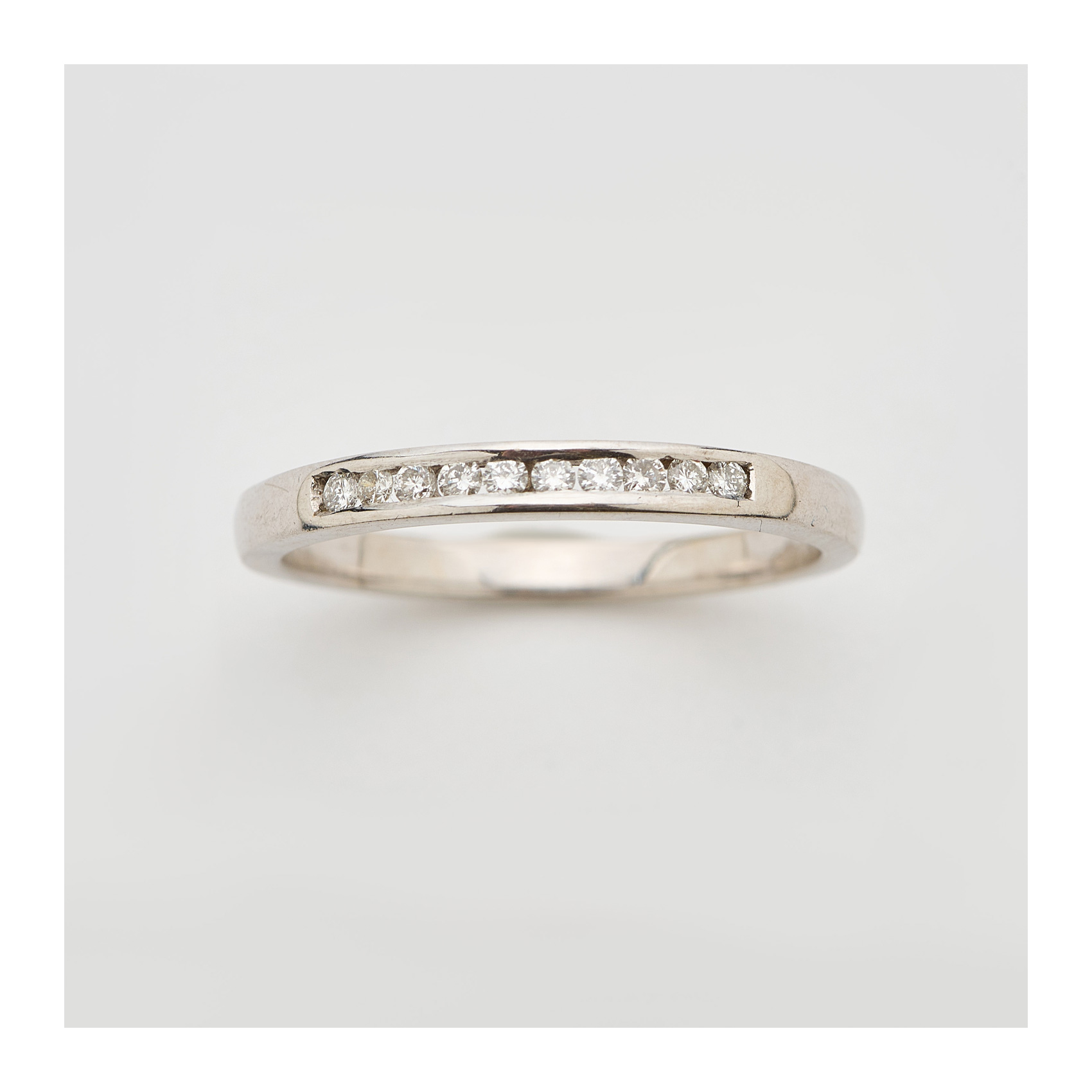 Sortija media alianza en oro blanco con diamantes talla brillante engastados en carril.