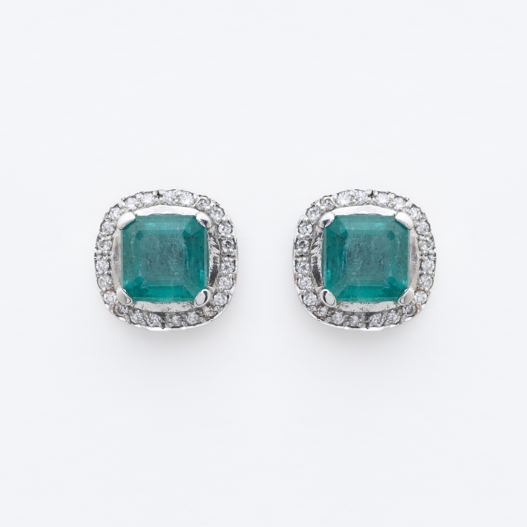 Pendientes en oro blanco con esmeralda talla octogonal orlada por diamantes talla brillante.