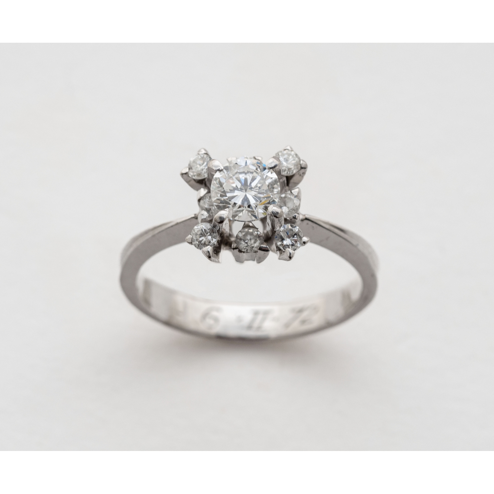 Sortija rosetón en oro blanco con diamantes talla brillante engastados en garras.