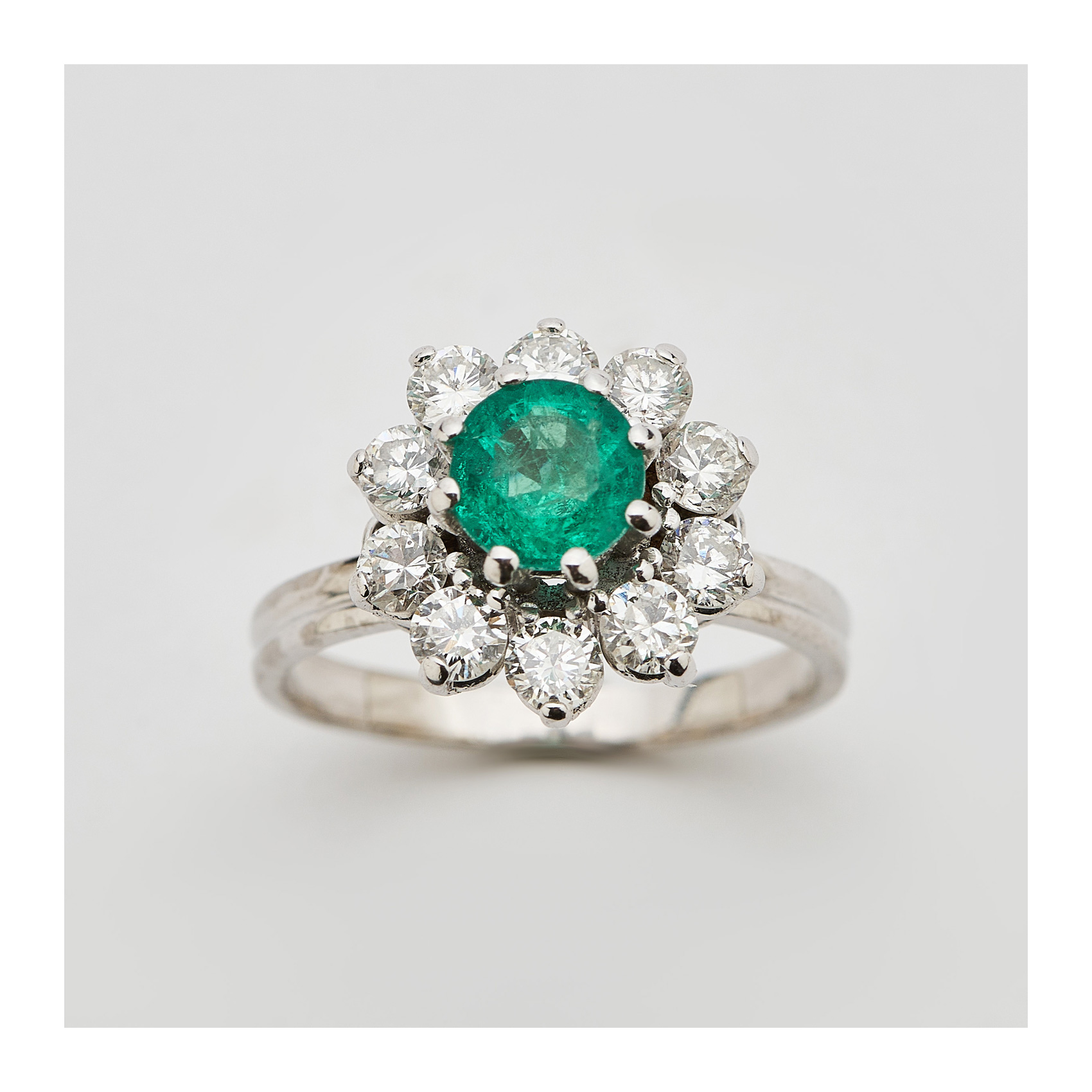 Sortija rosetón en oro blanco con esmeralda talla redonda orlada por diamantes talla brillante.