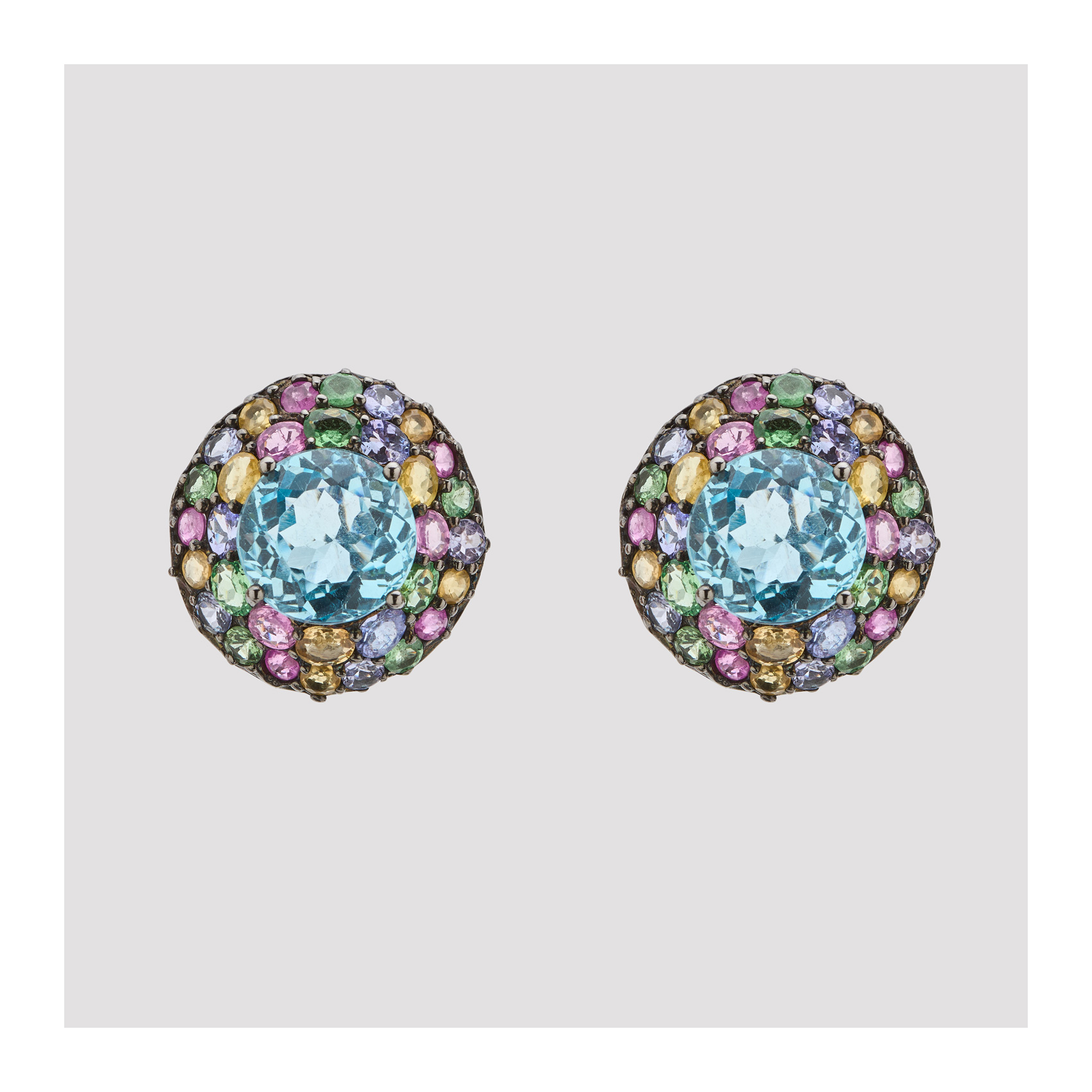 Pendientes en plata pavonada con topacio azul central talla redonda de 11,5 mm. y doble orla de iolitas y zafiros multicolor tallas oval y redonda.