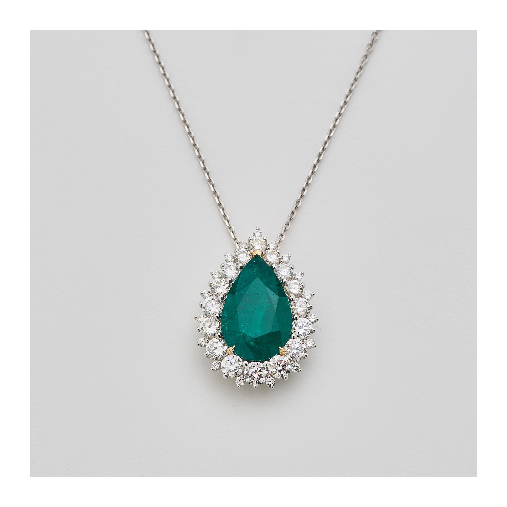 Gargantilla en oro blanco con esmeralda de Colombia talla perilla orlada por dos bandas de diamantes talla brillante.