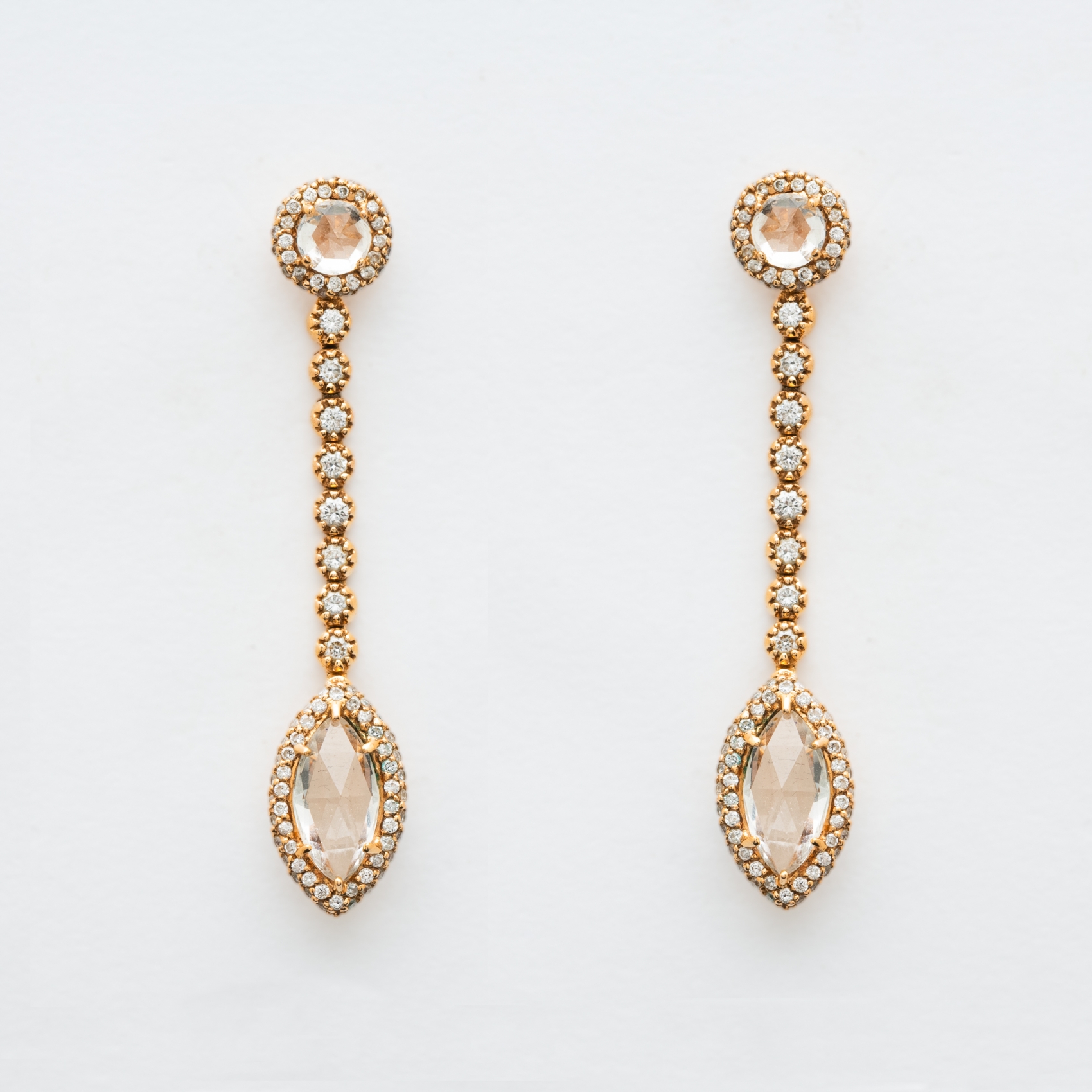 Pendientes en oro rosa con zafiros blancos talla marquise, talla rosa y diamantes talla brillante.