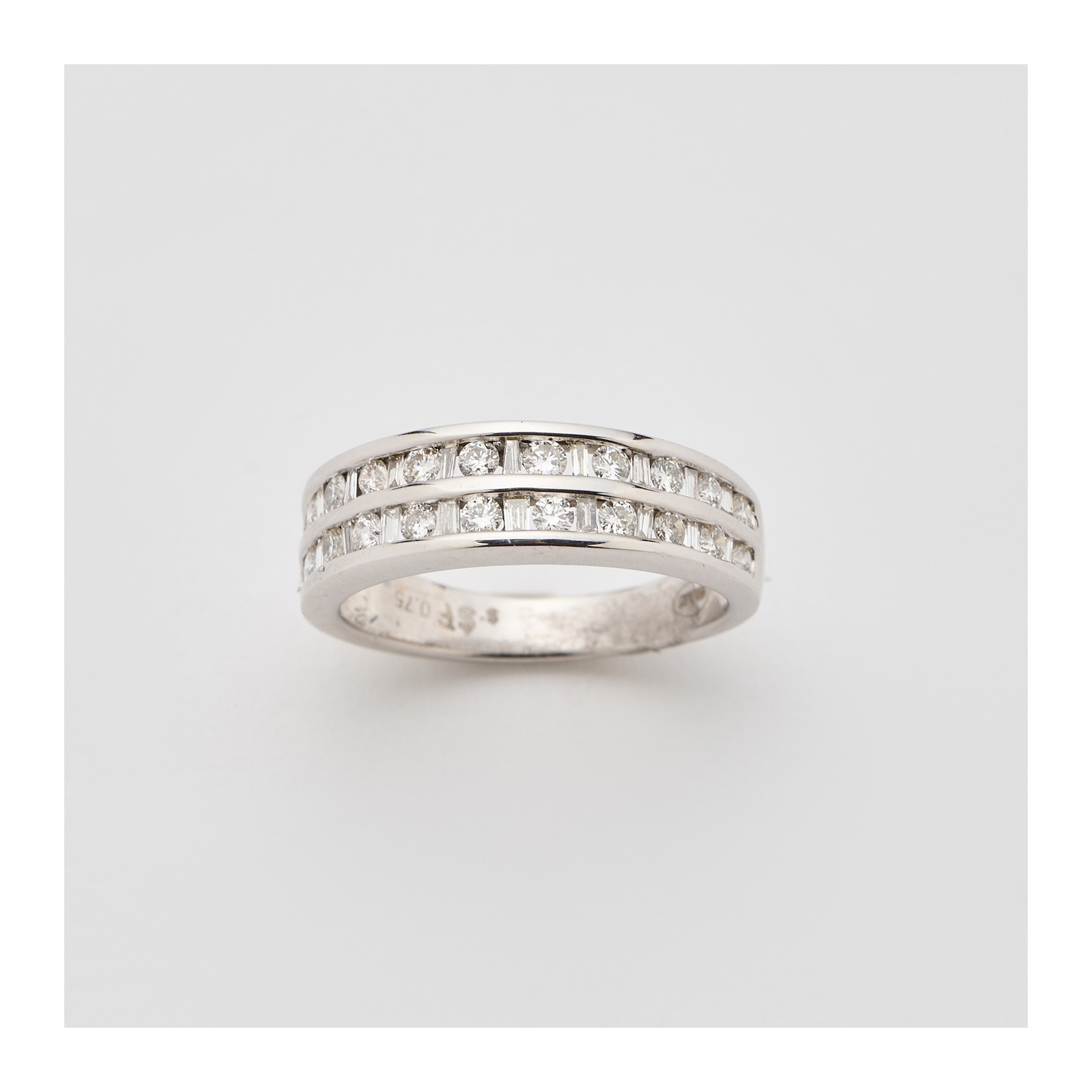Sortija en oro blanco con dos bandas de diamantes tallas brillante y trapecio alternados.