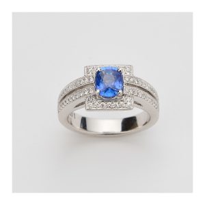 Pendientes en oro blanco con zafiros azules tallas marquise y carré orlados por diamantes talla brillante.