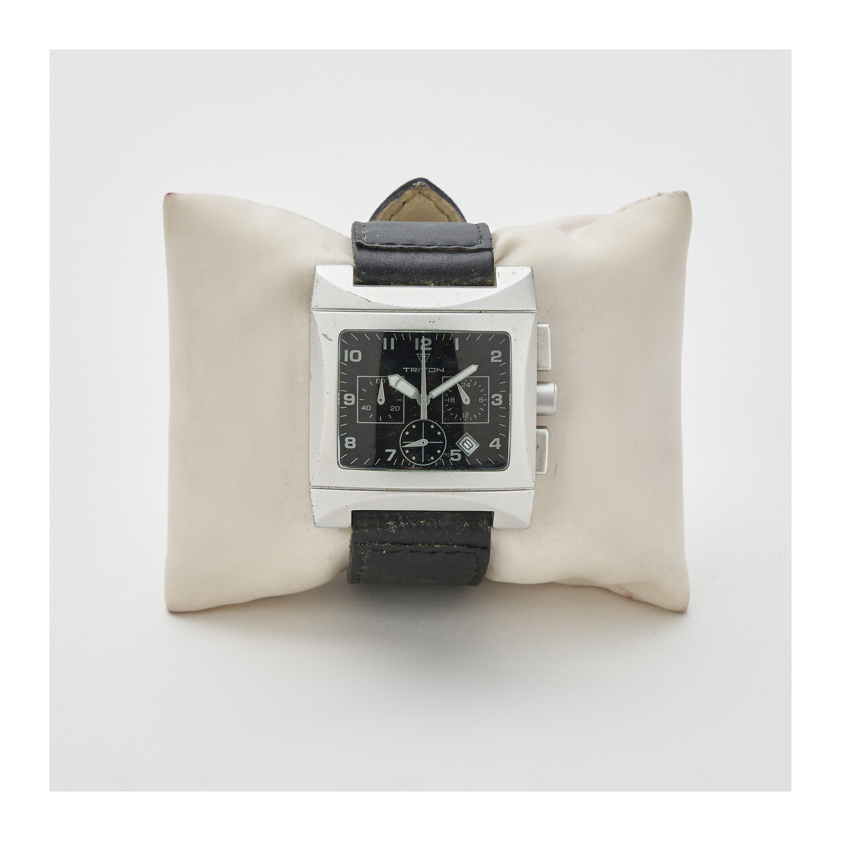 Reloj Triton de pulsera para caballero. En aluminio matizado y correa de piel. Esfera negra con numeración arábiga. Calendario fecha entre 4 y 5. Cronógrafo. Mecanismo de quartz.