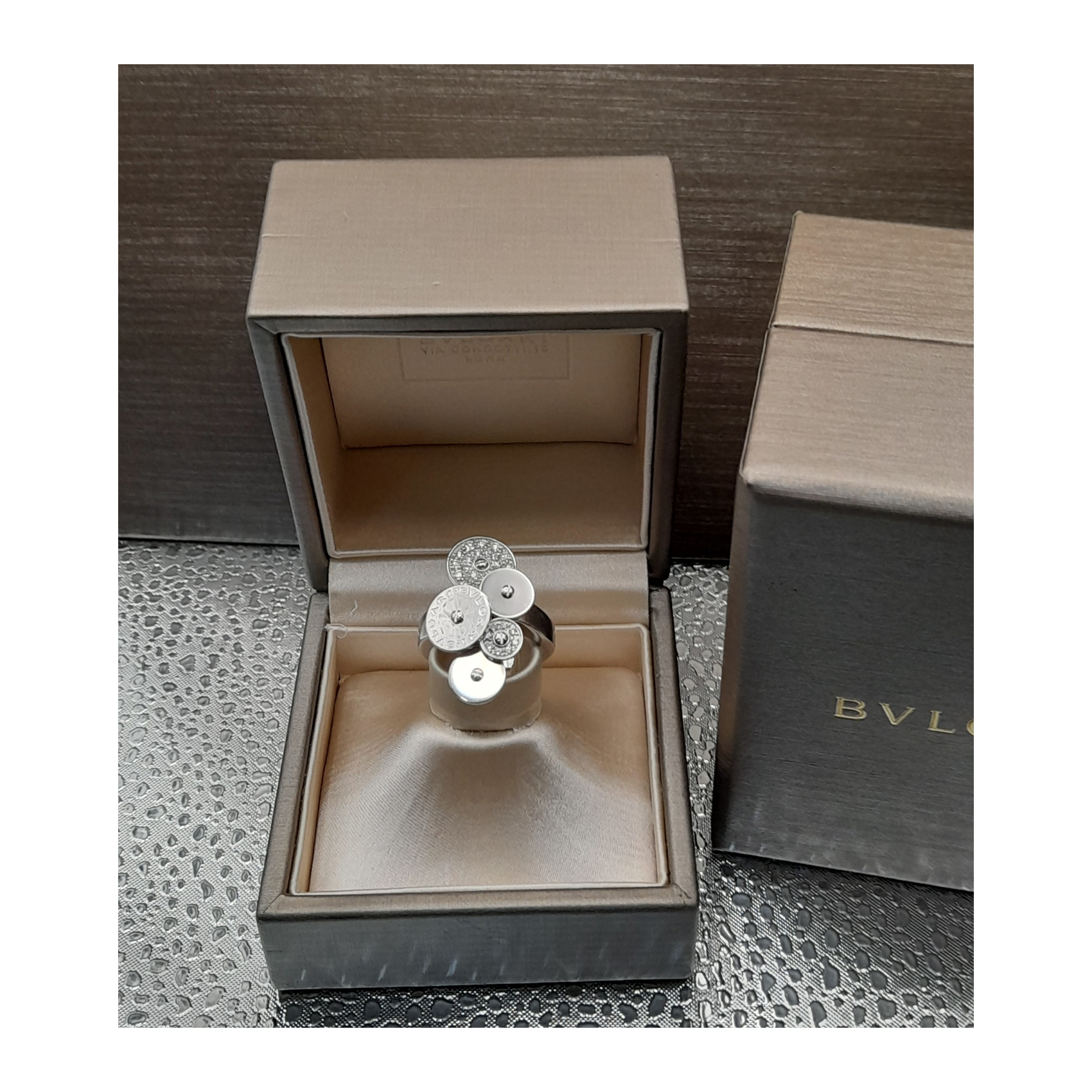 BVLGARI «Cicladi». Sortija de la prestigiosa firma realizada en oro blanco con cinco discos giratorios, dos con diamantes talla brillante engastados en pavé y uno con el nombre de la marca.