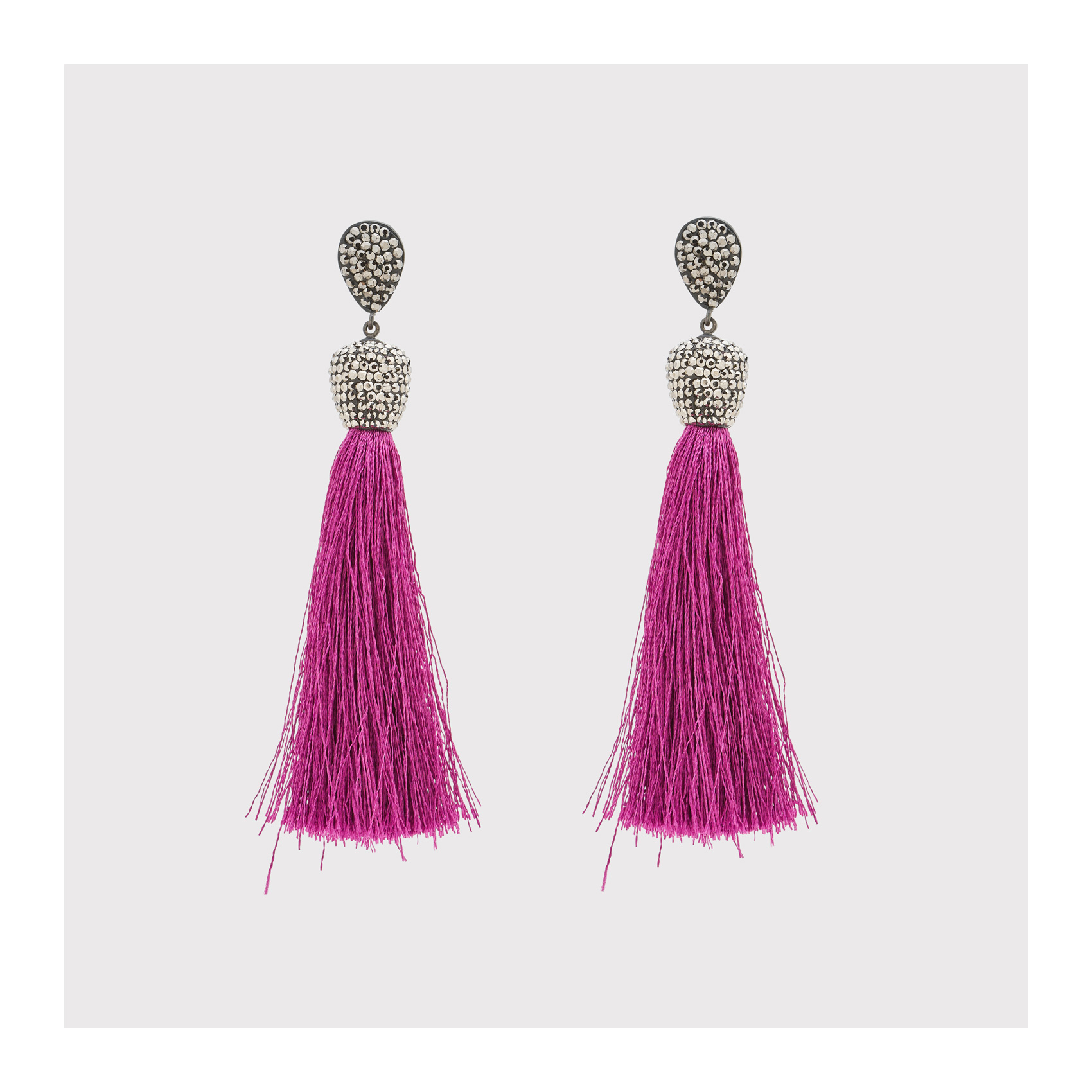 Pendientes largos en plata con lágrima y cazoleta de piedras grises metalizadas rematadas por flecos en color malva, 10 cm. Estimación:130 – 160€