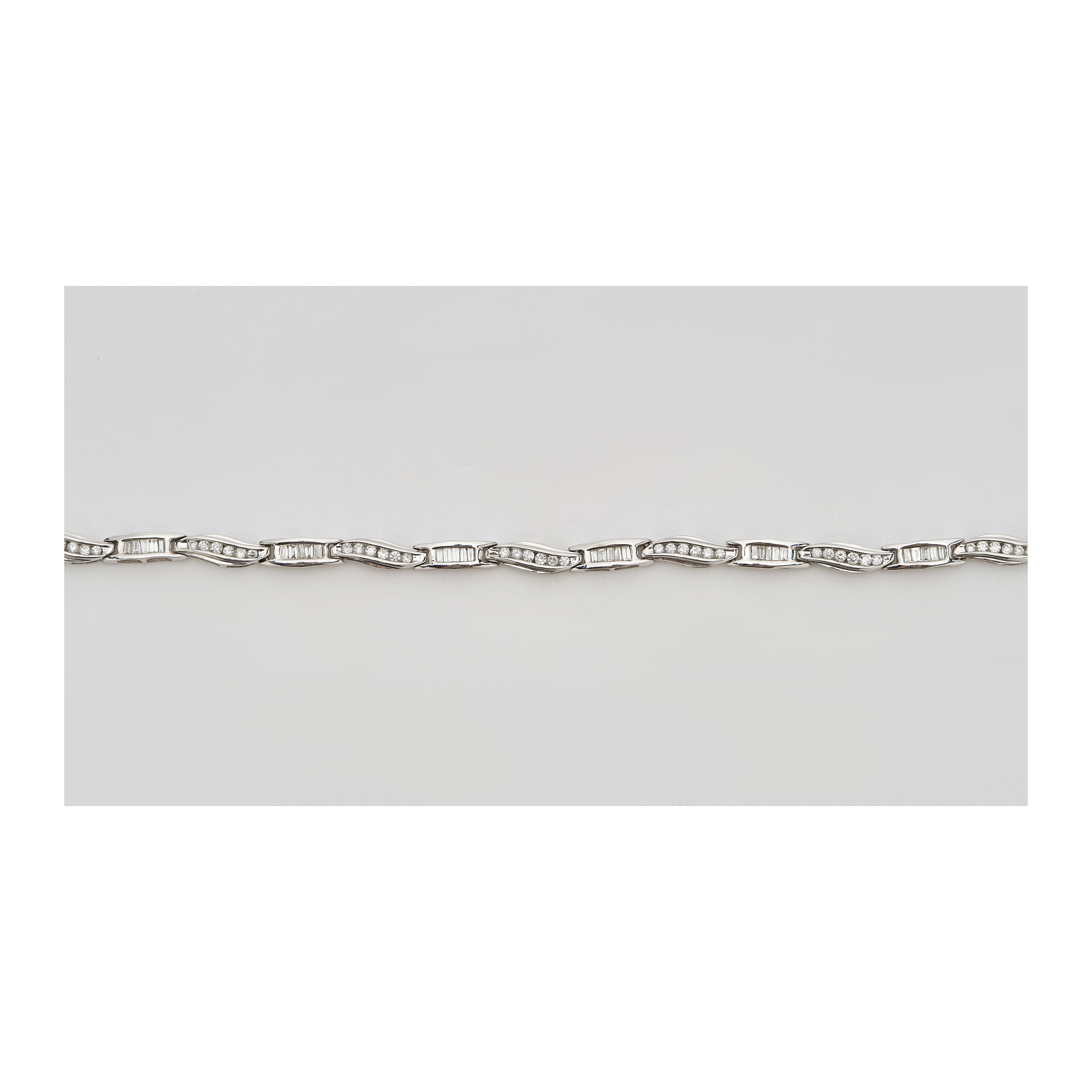 Pulsera en oro blanco con eslabones alternados de diamantes tallas brillante y trapecio engastados en carril.