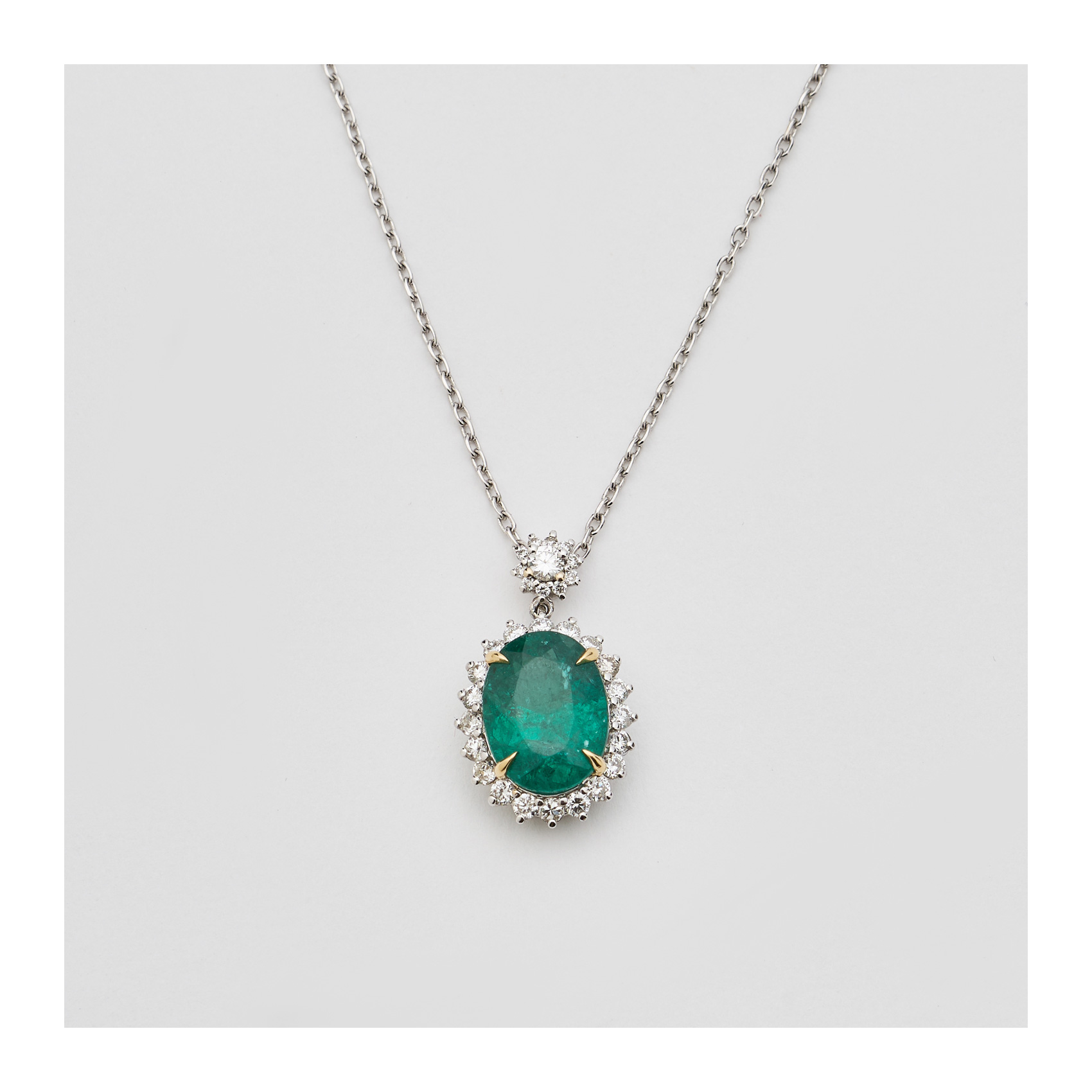 Gargantilla en oro blanco con rosetón de esmeralda de Zambia talla oval orlada por diamantes talla brillante.