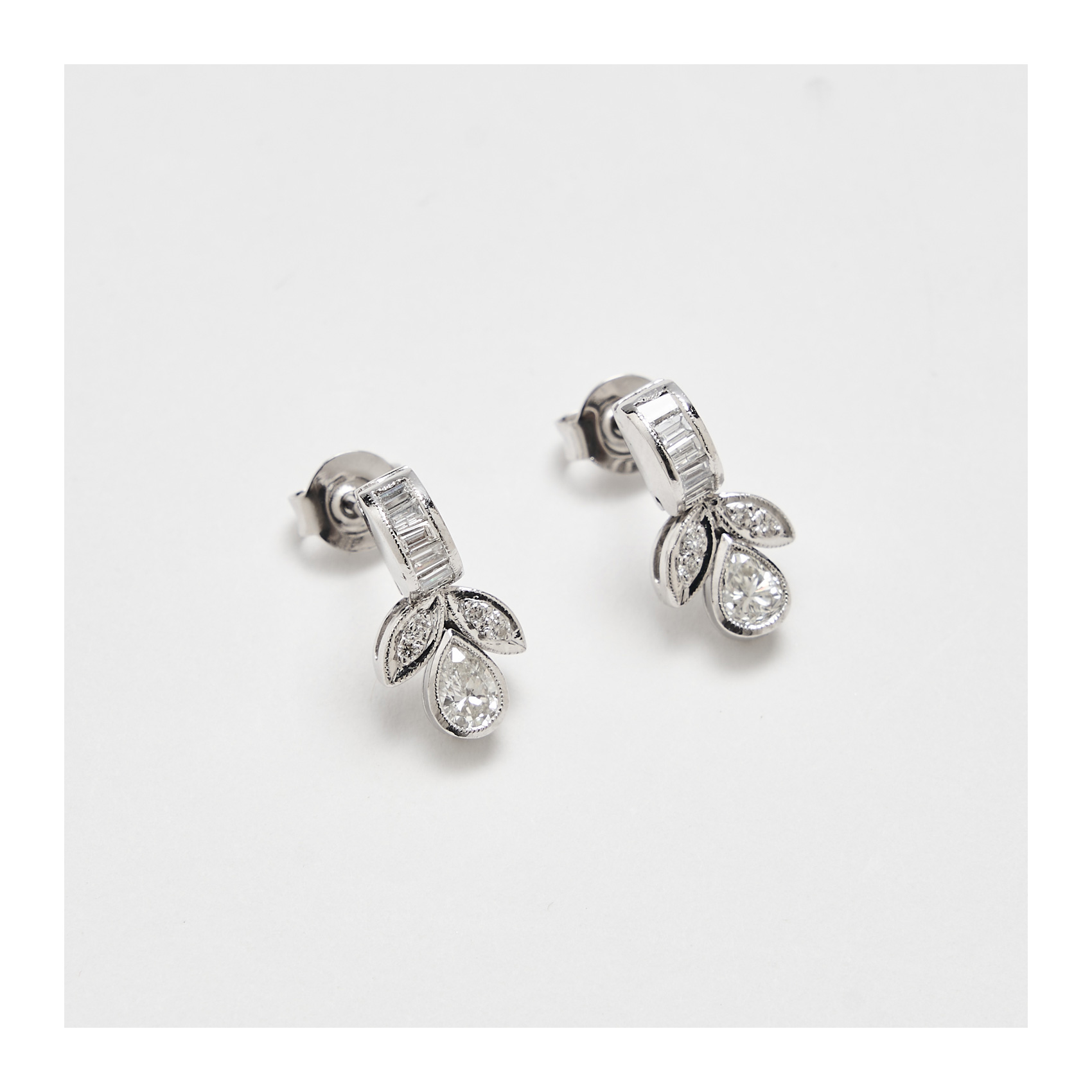 Pendientes en oro blanco con diamantes talla perilla, diamante y baguette.