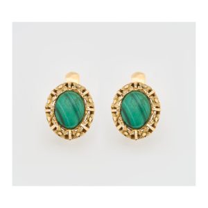 Pendientes en oro con cuenta de malaquita de 9 x 7 mm. y orla floral calada.