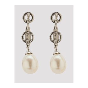 Pendientes largos en oro blanco con dos círculos y diamantes talla brillante rematados por perla cultivada oval de 10 x 8 mm.