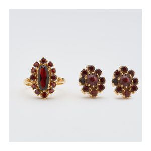 Conjunto de sortija y pendientes en oro con granates tallas oval y redonda engastados en garras.