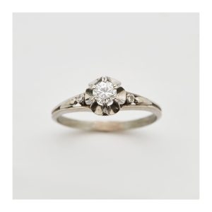 Sortija solitario en oro blanco con diamante talla brillante engastado en garras y custodiado por diamantes talla 8/8.